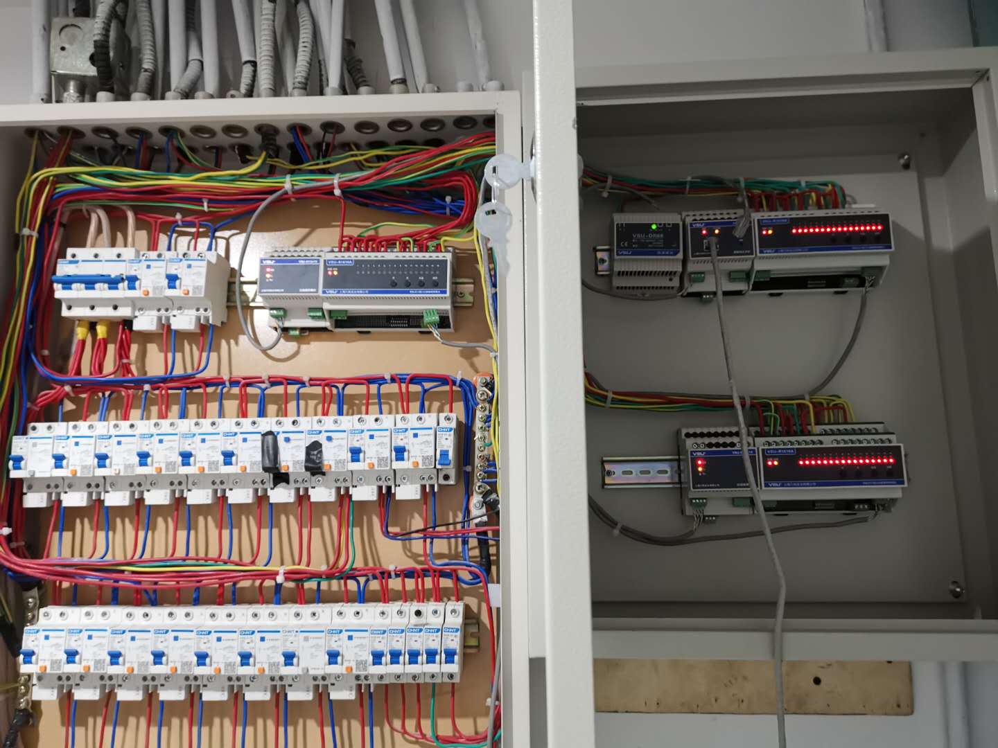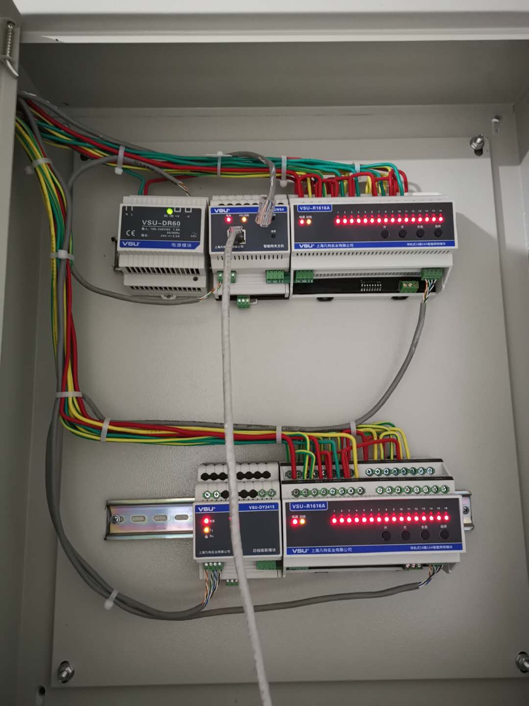 采用VSU總線型成套產(chǎn)品:智能網(wǎng)關(guān)主機(jī)控制整體,接受到手機(jī)或面板的指令輸送到開關(guān)執(zhí)行模塊進(jìn)行遠(yuǎn)程開關(guān)燈操作,采用的照明模塊是16路16A的,搭配DR60電源模塊、級聯(lián)模塊確保供電充沛。總線的特點是連產(chǎn)品的調(diào)試檢測都不需要到現(xiàn)場,遠(yuǎn)程即可將其調(diào)試就位。這個項目甚至連我司技術(shù)人員遠(yuǎn)程協(xié)助都不需要自己就安裝完成,可見其有多便于安裝,加上連接片用于串聯(lián)模塊,不是專業(yè)人員也可自主安裝使用。