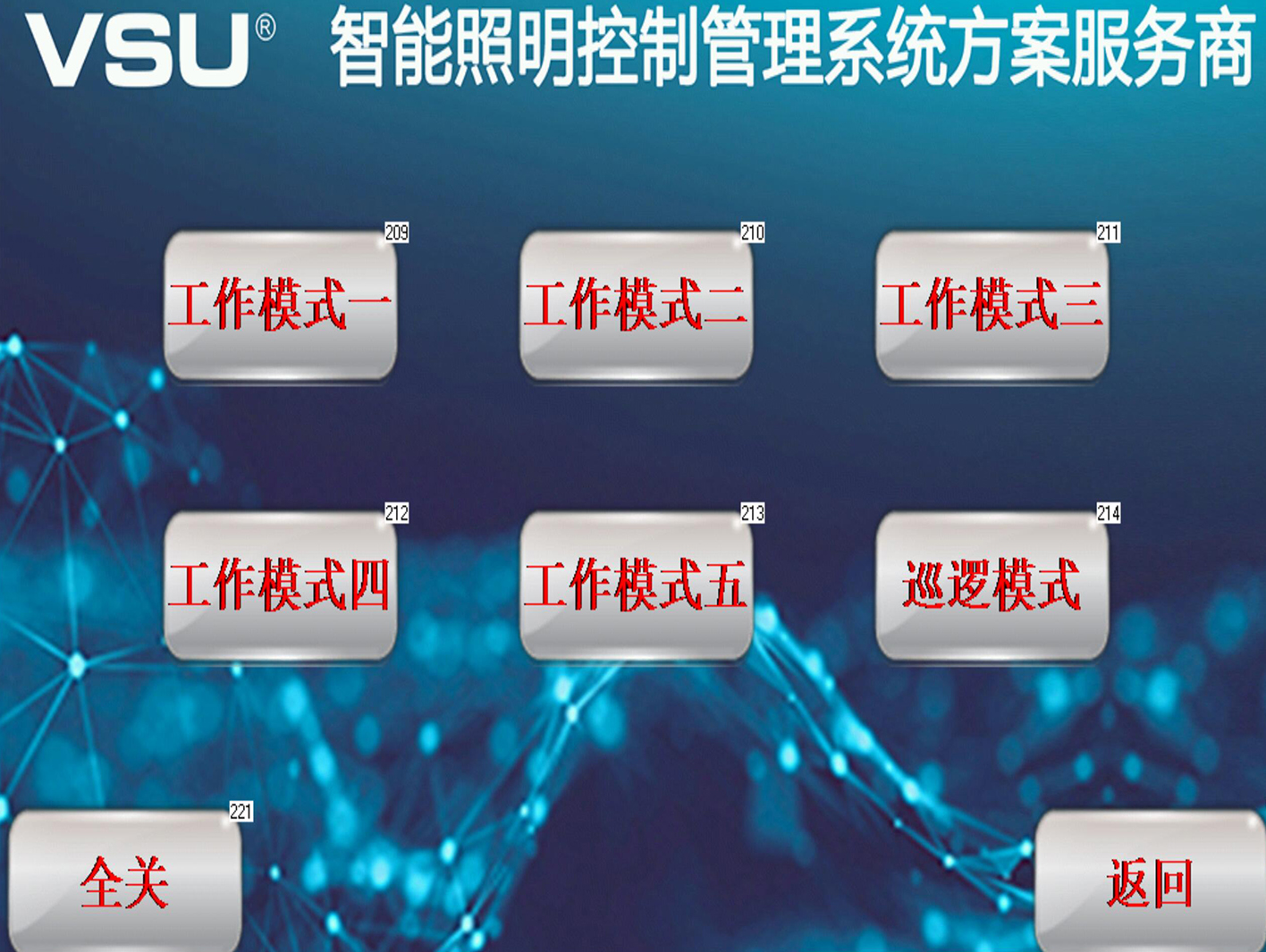 該項(xiàng)目中在智能照明領(lǐng)域采用的是VSU-NET總線型智能照明控制系統(tǒng),8路、12路、16路16A智能照明模塊、6鍵面板、7寸觸摸屏、電源模塊、網(wǎng)關(guān)模塊、級聯(lián)模塊等系列設(shè)備形成整個(gè)智能化照明控制系統(tǒng)。