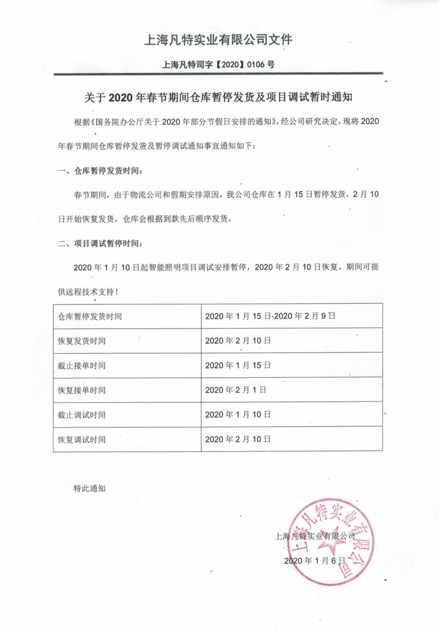 2020年春節(jié)期間暫停發(fā)貨、調試通知