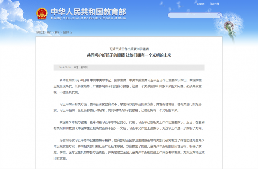 針對(duì)近年來(lái)我國(guó)兒童青少年近視率居高不下、不斷攀升,近視低齡化、重度化日益嚴(yán)重等問(wèn)題,習(xí)近平總書(shū)記曾指出:我國(guó)學(xué)生近視呈現(xiàn)高發(fā)、低齡化趨勢(shì),嚴(yán)重影響孩子們的身心健康,這是一個(gè)關(guān)系國(guó)家和民族未來(lái)的大問(wèn)題,必須高度重視,不能任其發(fā)展。有關(guān)方面要結(jié)合深化教育改革,拿出有效的綜合防治方案,督促各地區(qū)、各有關(guān)部門(mén)抓好落實(shí),同時(shí)強(qiáng)調(diào)全社會(huì)都要行動(dòng)起來(lái)。