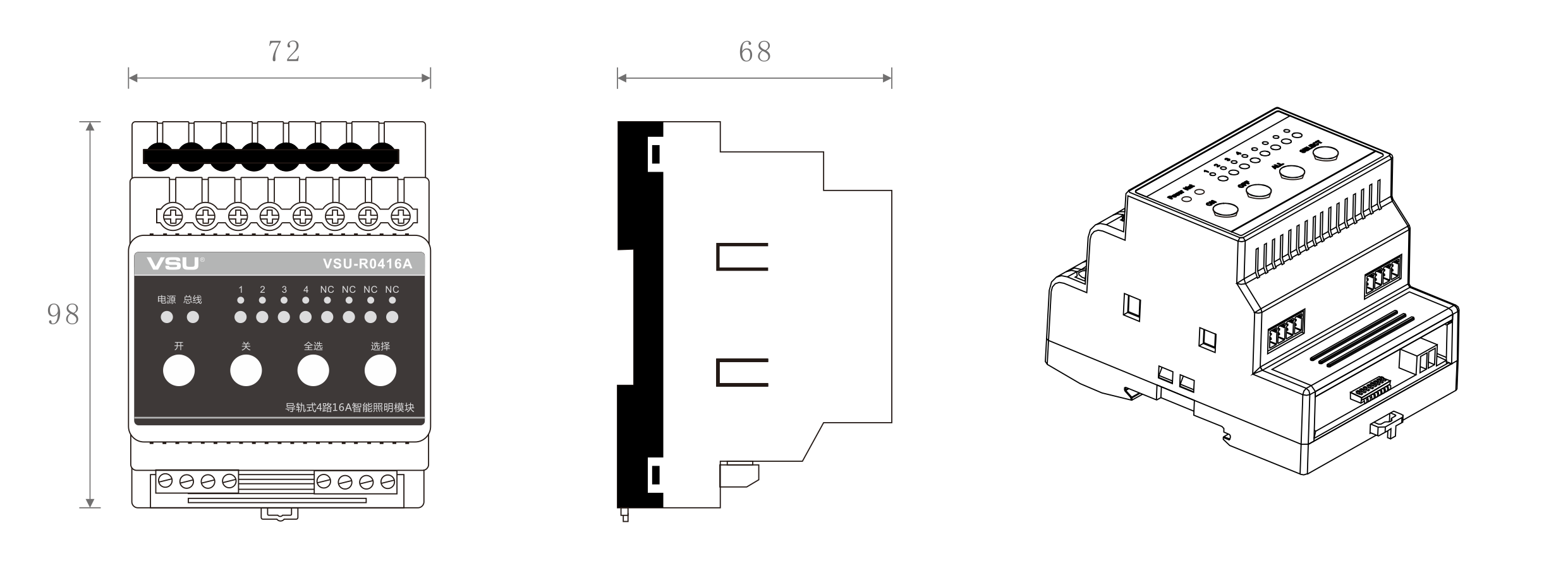 1,標(biāo)準(zhǔn)導(dǎo)軌式安裝占4個(gè)模數(shù)位;