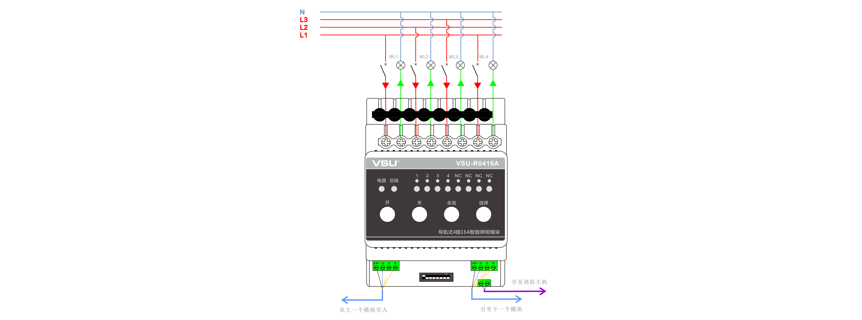本產(chǎn)品為導(dǎo)軌式安裝,含4路智能繼電器,每回路可獨(dú)立控制3520W燈具的開關(guān),帶應(yīng)急按鍵,LED燈時(shí)時(shí)指示各個(gè)回路開關(guān)狀態(tài)