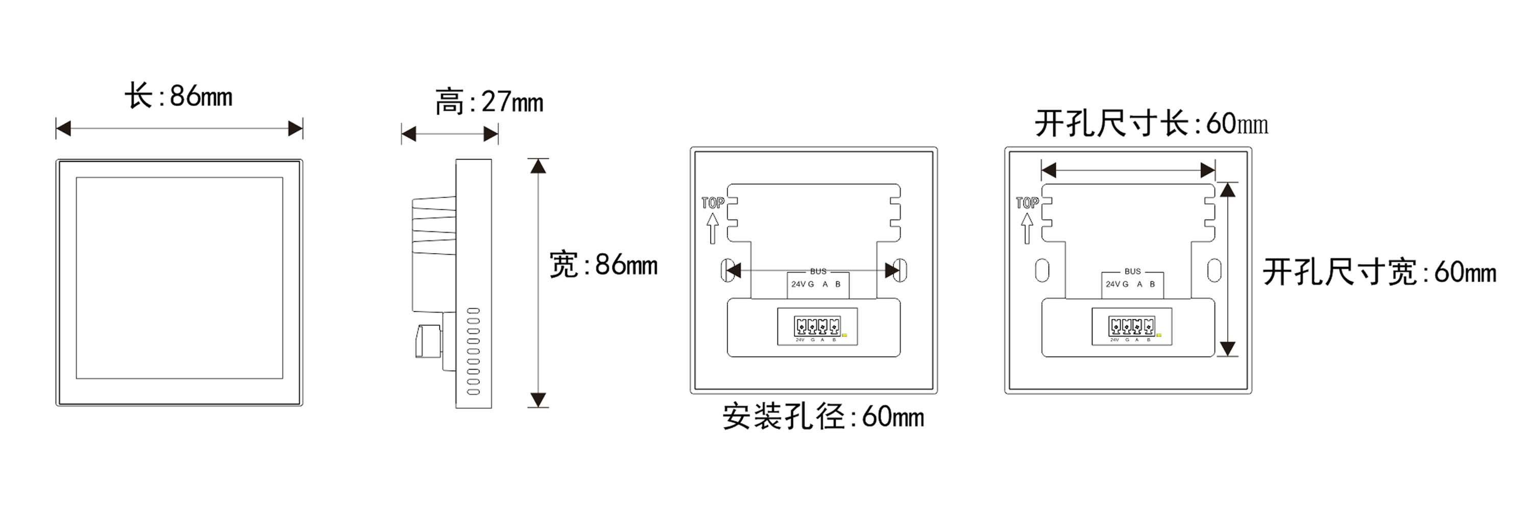 標(biāo)準(zhǔn)86盒安裝,4寸真彩屏,單控開關(guān)、窗簾和場景總線控制,可自定義界面支持3D文字、3D圖片,個(gè)性化界面;用于集中控制,支持雙向通信,安裝方便,接口靈活,適用于各種多媒體中央控制系統(tǒng)。