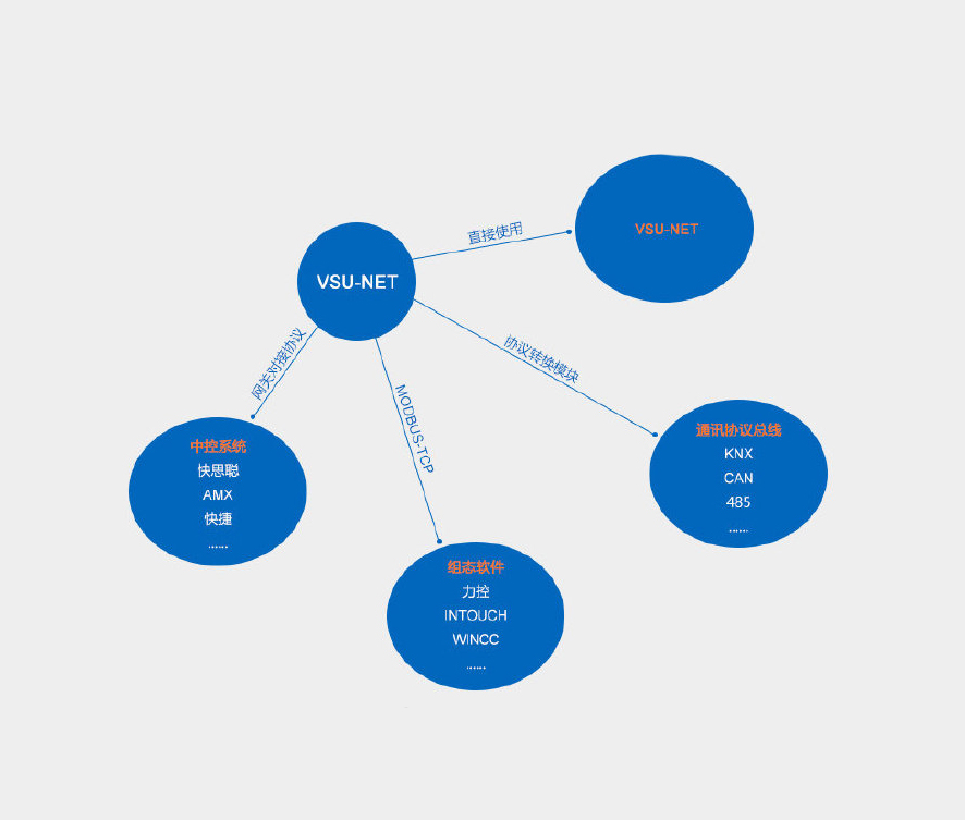VSU智能照明控制系統(tǒng)通過自主研發(fā)的VSU-NET通訊協(xié)議可以做到單獨自組解決方案,同時也可以與市場上不同通訊協(xié)議的系統(tǒng)搭配,實現(xiàn)靈活多樣的行業(yè)智能化控制解決方案。 VSU的VSU-NET···