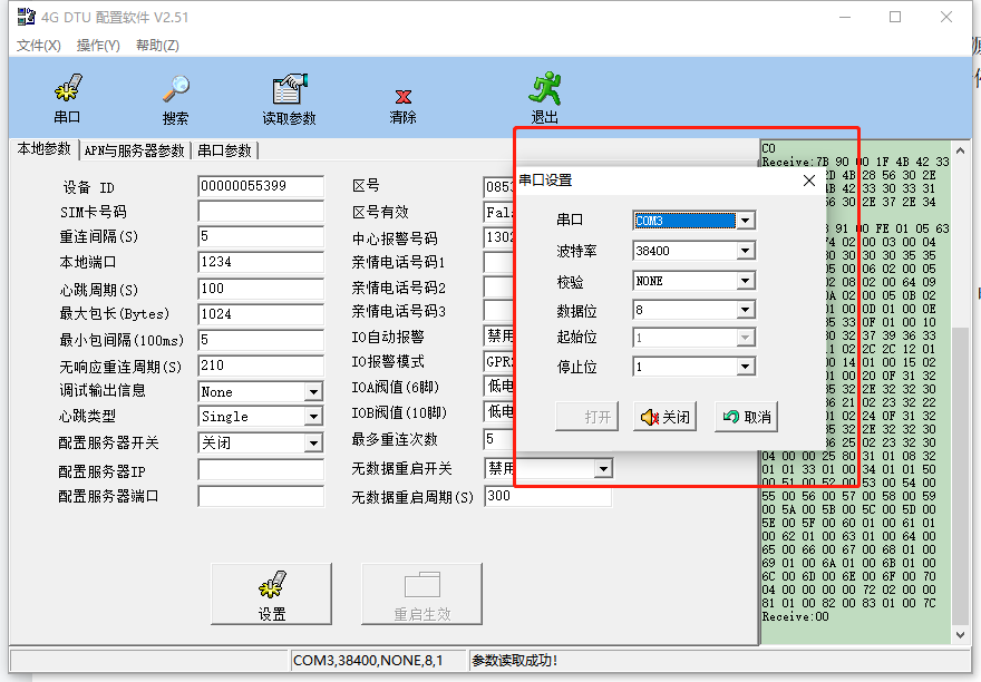 首先DTU設(shè)備不要上電,準(zhǔn)備USB轉(zhuǎn)RS485通信線接入DTU A B,USB線插入電腦,電腦在設(shè)備管理器找到相應(yīng)COM口,打開軟件4G DTU配置軟件設(shè)置相應(yīng)波特率參數(shù)即可,一般波特率設(shè)置先38400,設(shè)備上電(如果38400找不到設(shè)備,應(yīng)使用19200或9600來(lái)交替進(jìn)行。)具體操作詳見(jiàn)DTU設(shè)置說(shuō)明。